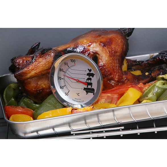 Lättavläst och tålig termometer, med tydlig röd nål som visar när köttet nått rätt temperatur. Illustrationer på termometern visar rekommenderad temperatur för olika köttslag; nöt, kalv, lamm, gris, kyckling.